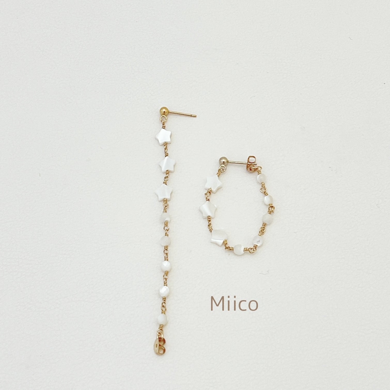 マザーオブパールの星と丸のループピアス。